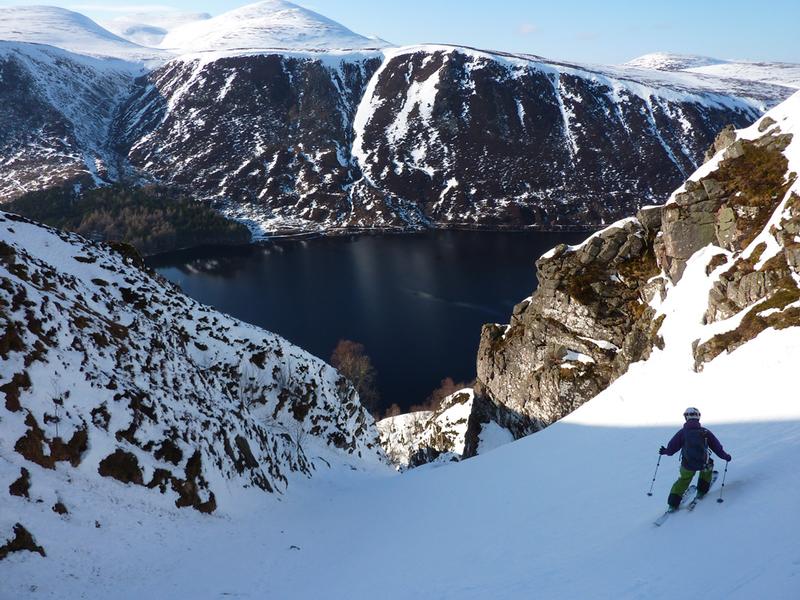 The slopes above Loch Muick may not be the first to feature in the thoughts of where to go for gully skiing in Scotland, but the nature of the terrain means that under certain conditions, they can provide some fun. With the tops of the runs around the 600-650m mark, these may be an option when conditions are too wild higher up the mountain, or you might take one of the lines in on return from either the Dubh Loch or Lochnagar. There are various aspects to choose from, depending upon snow conditions. Skiing above the loch is an enjoyable and memorable experience.