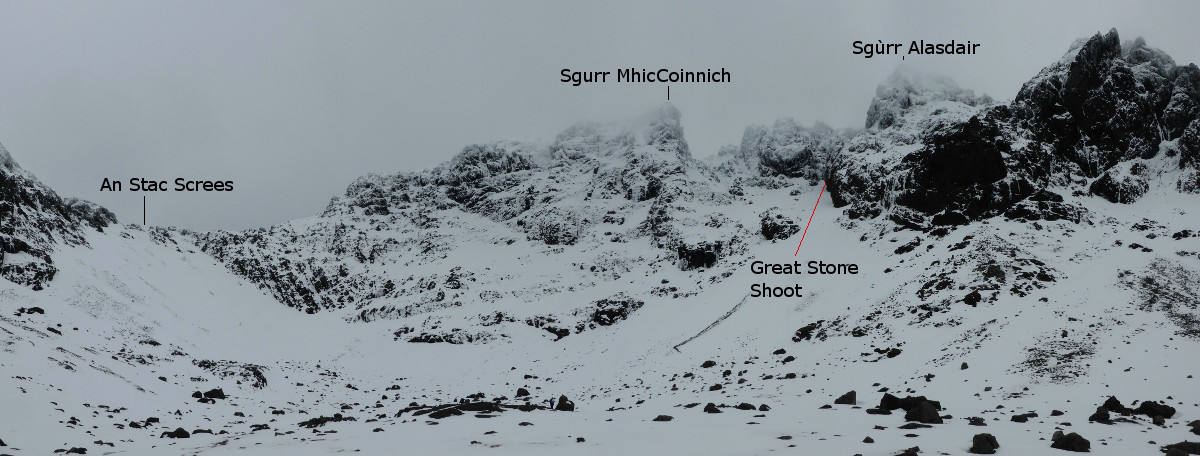 The most obvious feature in the corrie from a skiing point of view, is The Great Stone Shoot. This wide corridor separates Sgurr Alasdair from Sgurr Thearlaich, and the spine of the main ridge. The top of the gully is a narrow col, and in winter, forms an arete which is unlikely to ever form much of a cornice. On a clear day, the views out to sea over Coire a' Ghrunnda are superb.