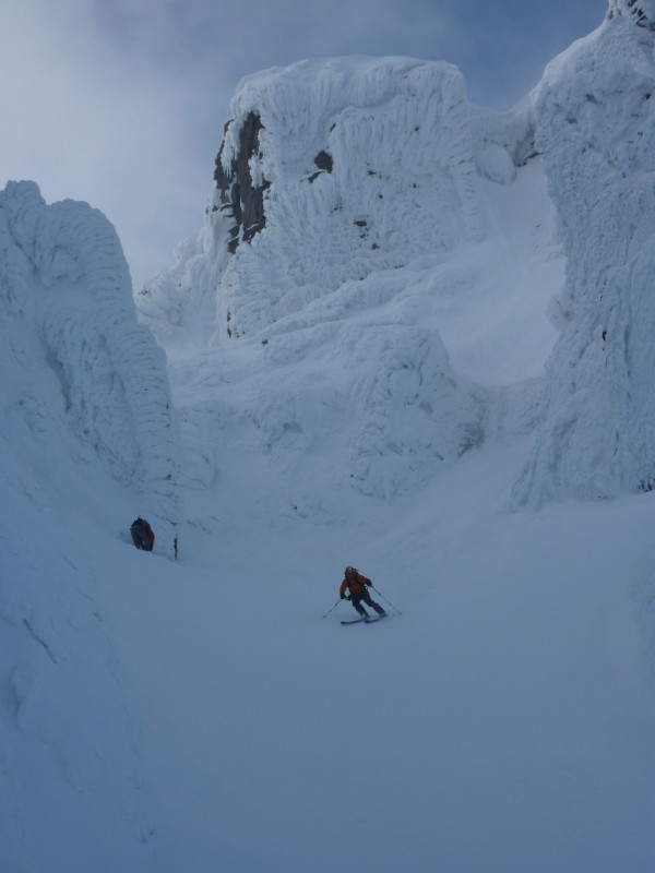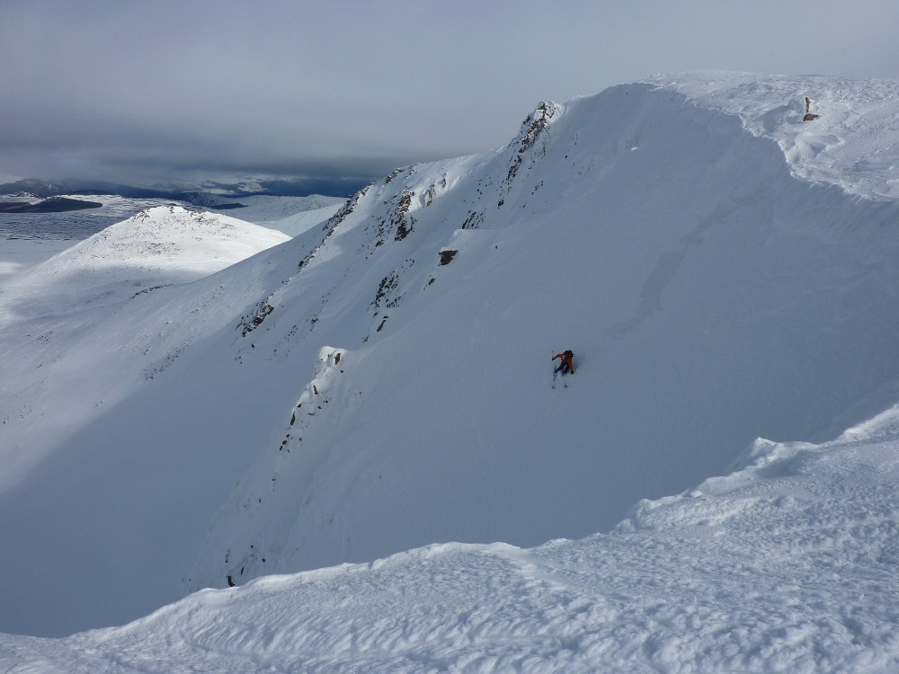 Ideal conditions will be stable snow following considerable snowfall on Southwesterly or Westerly winds. The top of the gully can be heavily corniced, particularly skiers right. The easiest entry is usually skiers left, where there may be a shallow runnel allowing access. The upper section of the gully funnels into a narrow steep section. This is the crux of the descent. It's very short, and not that steep, but crucially, it can often be icy or bare. Once beyond that section, the gully widens to the junction with the left hand branch. There can often be a scoop in the snow here at the junction. The lower section of the gully is wide and quite easy angled.